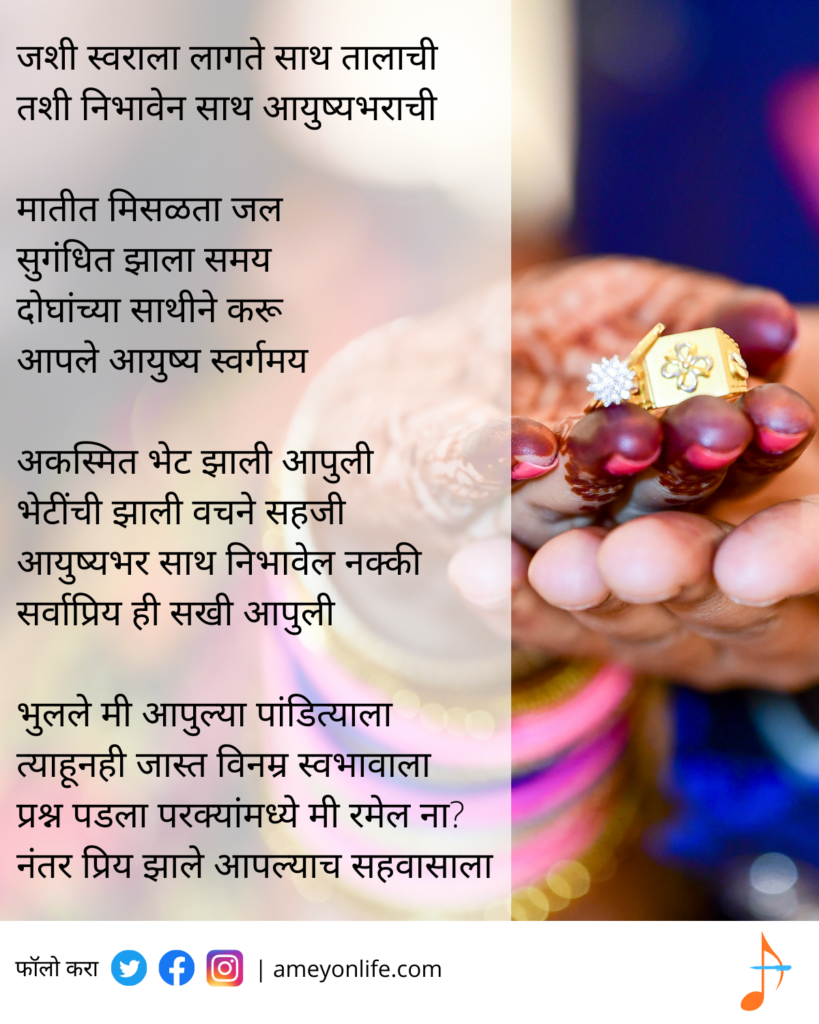 काही दिवसांपूर्वी माझ्या एका मैत्रिणीचे लग्न होते. मी लिहिलेल्या रचना तिला बहुदा आवडत असाव्यात. म्हणून तिच्या लग्नासाठी उखाणा लिहायला सांगितले. गोपनीयतेच्या कारणास्तव मी नावे काढली आहेत. परंतु एकंदर context वरून तुम्हाला प्रसंग लक्षात येईल. बघा आवडतोय का माझा पहिला उखाणा.