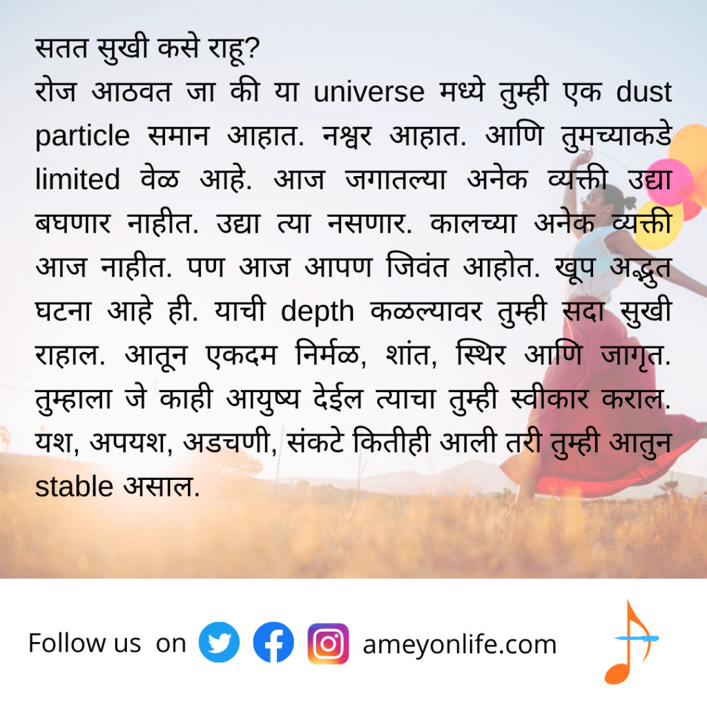 रोज आठवत जा की या universe मध्ये तुम्ही एक dust particle समान आहात. नश्वर आहात. आणि तुमच्याकडे limited वेळ आहे. आज जगातल्या अनेक व्यक्ती उद्या बघणार नाहीत. उद्या त्या नसणार. कालच्या अनेक व्यक्ती आज नाहीत. पण आज आपण जिवंत आहोत. खूप अद्भुत घटना आहे ही. याची depth कळल्यावर तुम्ही सदा सुखी राहाल. आतून एकदम निर्मळ, शांत, स्थिर आणि जागृत. तुम्हाला जे काही आयुष्य देईल त्याचा तुम्ही स्वीकार कराल. यश, अपयश, अडचणी, संकटे कितीही आली तरी तुम्ही आतुन stable असाल.